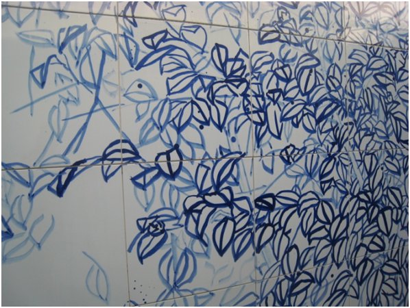 tiles, painted blue flowers and leaves, are on walls of the café, Kamitsubaki.
